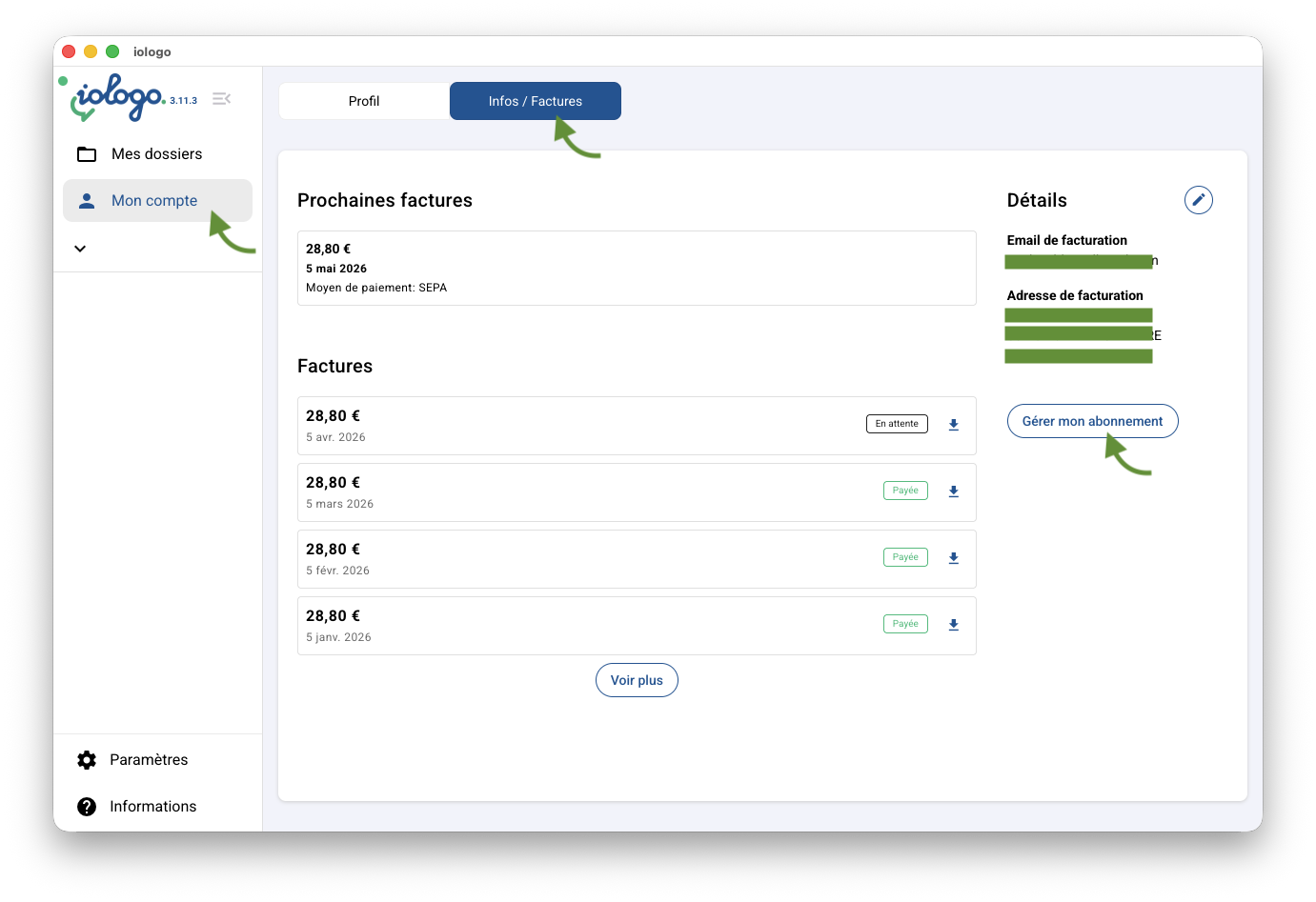 Ce lien d’accèsarrow-up-right vous permet de vous connecter à votre espace client. Sinon, rendez-vous dans iologo Mon compte -> Infos / Factures