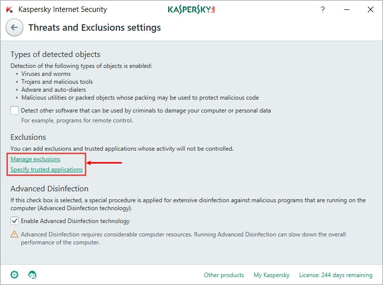 Sélectionnez Gérer les exclusions ou Spécifier les applications de confiance.