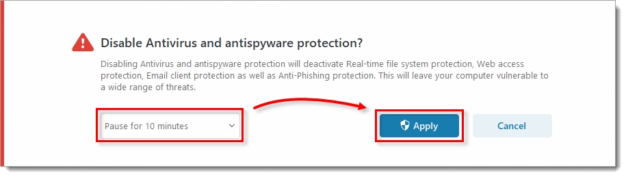 Sélectionnez la durée pour laquelle vous voulez désactiver l’antivirus et cliquez sur Appliquer